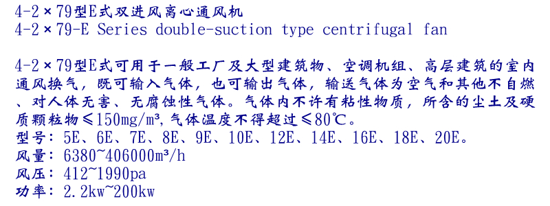 4-2×79型E式可用于一般工廠及大型建筑物、空調機組、高層建筑的室內通風換氣,既可輸入氣體,也可輸出氣體.